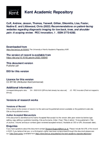 Cuff, Andrew, Jesson, Thomas, Yeowell, Gillian, Dikomitis, Lisa, Foster, Nadine E., Littlewood, Chris (2022) Recommendations on patient-facing websites regarding diagnostic imaging for low back, knee, and shoulder pain: A scoping review. PEC Innovation, 1 . Article Number 100040. ISSN 2772-6282. (doi:10.1016/j.pecinn.2022.100040) (KAR id:100045)