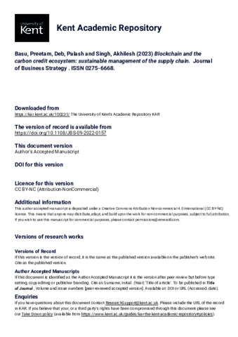 Basu, Preetam, Deb, Palash, Singh, Akhilesh (2023) Blockchain and the carbon credit ecosystem: sustainable management of the supply chain. Journal of Business Strategy, . ISSN 0275-6668. (doi:10.1108/JBS-09-2022-0157) (KAR id:100231)
