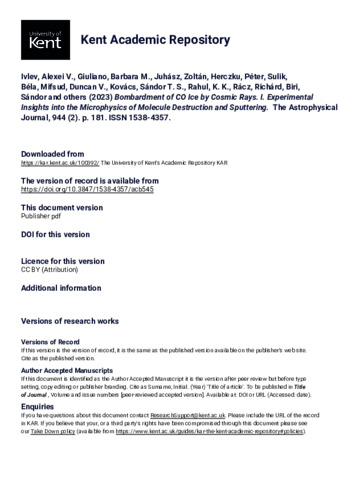 Ivlev, Alexei V., Giuliano, Barbara M., Juhász, Zoltán, Herczku, Péter, Sulik, Béla, Mifsud, Duncan V., Kovács, Sándor T. S., Rahul, K. K., Rácz, Richárd, Biri, Sándor, and others. (2023) Bombardment of CO Ice by Cosmic Rays. I. Experimental Insights into the Microphysics of Molecule Destruction and Sputtering. Astrophysical Journal, 944 (2). Article Number 181. ISSN 1538-4357. (doi:10.3847/1538-4357/acb545) (KAR id:100392)