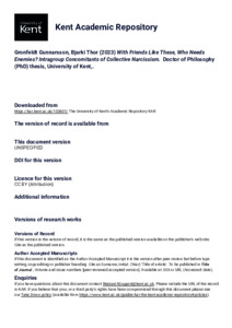 Gronfeldt Gunnarsson, Bjarki Thor (2023) With Friends Like These, Who Needs Enemies? Intragroup Concomitants of Collective Narcissism. Doctor of Philosophy (PhD) thesis, University of Kent,. (doi:10.22024/UniKent/01.02.100601) (KAR id:100601)