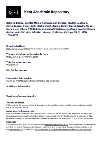 Bojkova, Denisa, Bechtel, Marco, Rothenburger, Tamara, Kandler, Joshua D., Hayes, Lauren, Olmer, Ruth, Martin, Ulrich, Jonigk, Danny, Ciesek, Sandra, Wass, Mark N., and others. (2023) Omicron‐induced interferon signaling prevents influenza A H1N1 and H5N1 virus infection. Journal of Medical Virology, 95 (3). Article Number e28686. ISSN 1096-9071. (doi:10.1002/jmv.28686) (KAR id:100643)