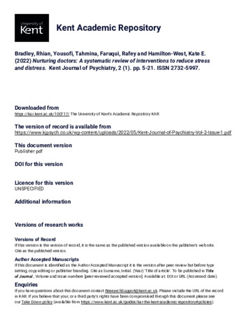 Bradley, Rhian, Yousofi, Tahmina, Faruqui, Rafey, Hamilton-West, Kate E. (2022) Nurturing doctors: A systematic review of interventions to reduce stress and distress. Kent Journal of Psychiatry, 2 (1). pp. 5-21. ISSN 2732-5997. (KAR id:100717)