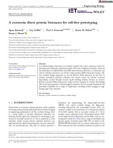 Kennedy, Agata, Griffin, Guy, Freemont, Paul S, Polizzi, Karen M, Moore, Simon J. (2022) A curcumin direct protein biosensor for cell-free prototyping. Engineering Biology, 6 (2-3). pp. 62-68. ISSN 2398-6182. (doi:10.1049/enb2.12024) (KAR id:100820)