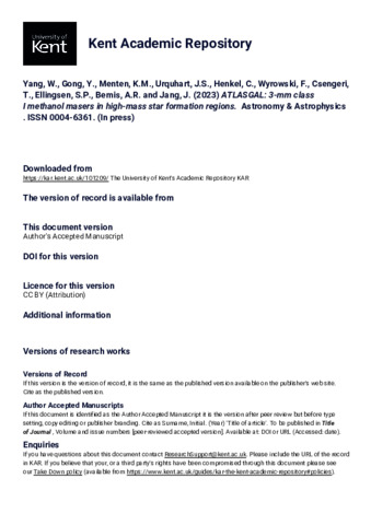 Yang, W., Gong, Y., Menten, K.M., Urquhart, J.S., Henkel, C., Wyrowski, F., Csengeri, T., Ellingsen, S.P., Bemis, A.R., Jang, J. and others. (2023) ATLASGAL: 3-mm class I methanol masers in high-mass star formation regions. Astronomy & Astrophysics, 675 . Article Number A112. ISSN 0004-6361. (doi:0.1051/0004-6361/202346227) (KAR id:101209)