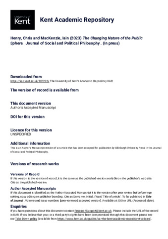 Henry, Chris, MacKenzie, Iain (2023) The Changing Nature of the Public Sphere. Journal of Social and Political Philosophy, 2 (2). pp. 175-190. ISSN 2752-7514. E-ISSN 2752-7522. (doi:10.3366/jspp.2023.0056) (KAR id:101226)