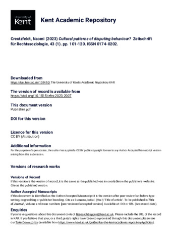 Creutzfeldt, Naomi (2023) Cultural patterns of disputing behaviour? Zeitschrift für Rechtssoziologie, 43 (1). pp. 101-120. ISSN 0174-0202. E-ISSN 2366-0392. (doi:10.1515/zfrs-2023-2007) (KAR id:101410)