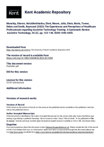 Manship, Sharon, Hatzidimitriadou, Eleni, Moore, Julia, Stein, Maria, Towse, Debra, Smith, Raymond (2023) The Experiences and Perceptions of Healthcare Professionals regarding Assistive Technology Training: A Systematic Review. Assistive Technology, 36 (2). pp. 123-146. ISSN 1040-0435. E-ISSN 1949-3614. (doi:10.1080/10400435.2023.2219294) (KAR id:101412)