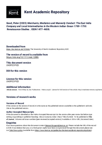 Good, Peter (2023) Merchants, Mediators and Mannerly Conduct: The East India Company and Local Intermediaries in the Western Indian Ocean 1700–1750. Renaissance Studies, . ISSN 0269-1213. E-ISSN 1477-4658. (doi:10.1111/rest.12886) (KAR id:101666)