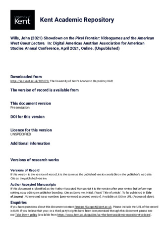 Wills, John (2021) Showdown on the Pixel Frontier: Videogames and the American West Guest Lecture. In: Digital Americas Austrian Association for American Studies Annual Conference, April 2021, Online. (Unpublished) (KAR id:101673)