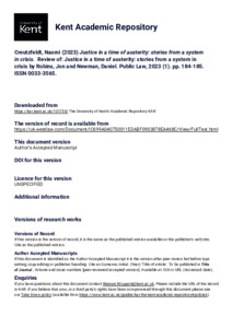 Creutzfeldt, Naomi (2023) Justice in a time of austerity: stories from a system in crisis - NC Review. Review of: Justice in a time of austerity: stories from a system in crisis by UNSPECIFIED. Public Law, (1). pp. 184-185. ISSN 0033-3565. (KAR id:101750)