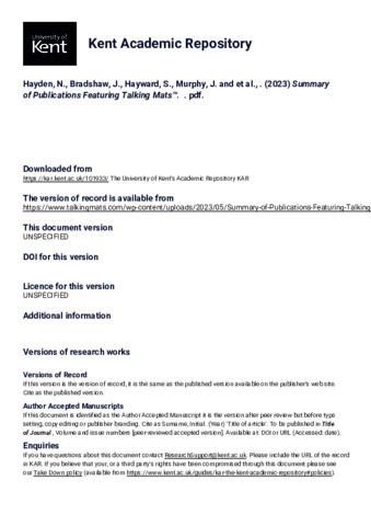 Hayden, N., Bradshaw, J., Hayward, S., Murphy, J. (2023) Summary of Publications Featuring Talking Mats™. . pdf. (KAR id:101933)