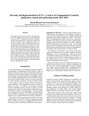 This paper examines issues of diversity and representa- tion in the International Conference on Computational Creativity (ICCC), evaluating the diversity of authors, content and existing creative systems. We consider: the diversity of cultural context of published systems; di- versity of authors in terms of gender and culture; how the pandemic affected diversity; and trends in content of accepted papers. The study covers a period of six con- secutive years around the COVID-19 pandemic (2017- 22), to better understand the impact of the pandemic on diversity. The research team includes individuals from different career stages and research interests, who bring diverse perspectives to the analysis. We evidence the need for greater diversity in both authorship and con- tent, as well as in the creative systems discussed in the proceedings. The paper concludes with recommenda- tions for increasing diversity and representation in the field of computational creativity.