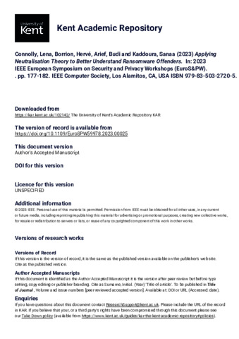 Connolly, Lena, Borrion, Hervé, Arief, Budi, Kaddoura, Sanaa (2023) Applying Neutralisation Theory to Better Understand Ransomware Offenders. In: 2023 IEEE European Symposium on Security and Privacy Workshops (EuroS&PW). . pp. 177-182. IEEE Computer Society, Los Alamitos, CA, USA ISBN 979-8-3503-2720-5. (doi:10.1109/EuroSPW59978.2023.00025) (KAR id:102142)
