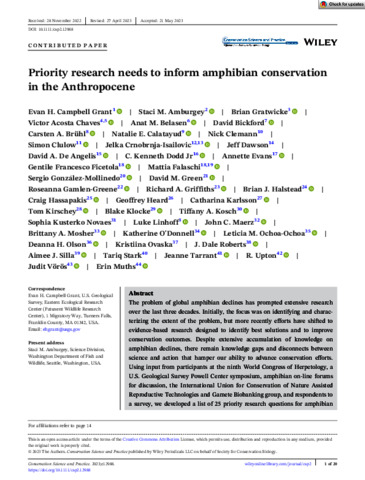 Campbell Grant, Evan H., Amburgey, Staci M., Gratwicke, Brian, Chaves, Victor Acosta, Belasen, Anat M., Bickford, David, Brühl, Carsten A., Calatayud, Natalie E., Clemann, Nick, Clulow, Simon, and others. (2023) Priority research needs to inform amphibian conservation in the Anthropocene. Conservation Science and Practice, 5 (9). Article Number e12988. E-ISSN 2578-4854. (doi:10.1111/csp2.12988) (KAR id:102147)