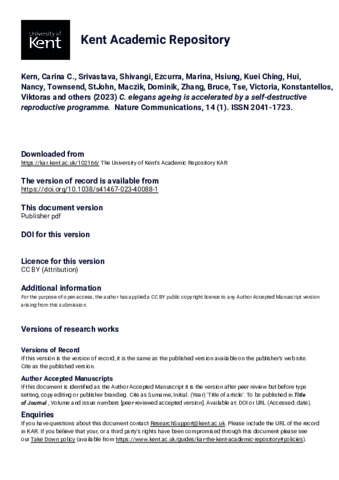Kern, Carina C., Srivastava, Shivangi, Ezcurra, Marina, Hsiung, Kuei Ching, Hui, Nancy, Townsend, StJohn, Maczik, Dominik, Zhang, Bruce, Tse, Victoria, Konstantellos, Viktoras, and others. (2023) C. elegans ageing is accelerated by a self-destructive reproductive programme. Nature Communications, 14 (1). Article Number 4381. ISSN 2041-1723. (doi:10.1038/s41467-023-40088-1) (KAR id:102166)
