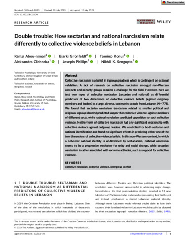Abou-Ismail, Ramzi, Gronfeldt, Bjarki, Konur, Tamino, Cichocka, Aleksandra, Phillips, Joseph, Sengupta, Nikhil K. (2023) Double Trouble: How Sectarian and National Narcissism Relate Differently to Collective Violence Beliefs in Lebanon. Aggressive Behavior, 49 (6). pp. 669-678. ISSN 0096-140X. E-ISSN 1098-2337. (doi:10.1002/ab.22104) (KAR id:102178)