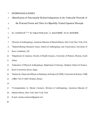 Cazenave, Marine, Nakatsukasa, Masato, Mazurier, Arnaud, Skinner, Matthew M. (2024) Identification of functionally-related adaptations in the trabecular network of the proximal femur and tibia of a bipedally-trained Japanese macaque. Anthropological Science, 132 (1). pp. 13-26. ISSN 0918-7960. (doi:10.1537/ase.2307142) (KAR id:102184)
