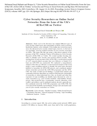 Mahaini, Mohamad Imad, Li, Shujun (2023) Cyber Security Researchers on Online Social Networks: From the Lens of the UK’s ACEs-CSR on Twitter. In: Lecture Notes in Computer Science. Security and Privacy in Social Networks and Big Data: 9th International Symposium, SocialSec 2023, Canterbury, UK, August 14–16, 2023, Proceedings. Lecture Notes in Computer Science , 14097. pp. 129-148. Springer, Singapore E-ISBN 978-981-99-5177-2. (doi:10.1007/978-981-99-5177-2_8) (KAR id:102392)