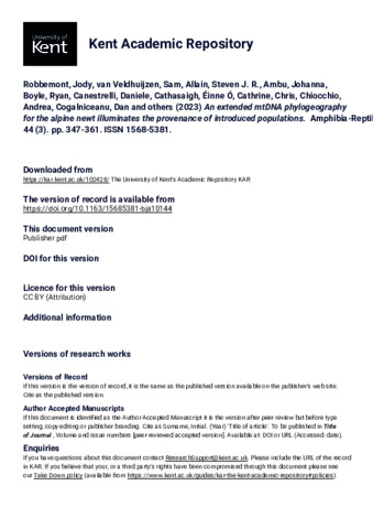 Robbemont, Jody, van Veldhuijzen, Sam, Allain, Steven J. R., Ambu, Johanna, Boyle, Ryan, Canestrelli, Daniele, Cathasaigh, Éinne Ó, Cathrine, Chris, Chiocchio, Andrea, Cogalniceanu, Dan, and others. (2023) An extended mtDNA phylogeography for the alpine newt illuminates the provenance of introduced populations. Amphibia-Reptilia, 44 (3). pp. 347-361. ISSN 1568-5381. (doi:10.1163/15685381-bja10144) (KAR id:102428)