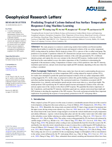 Cui, Hongxing, Tang, Danling, Mei, Wei, Liu, Hongbin, Sui, Yi, Gu, Xiaowei (2023) Predicting Tropical Cyclone-Induced Sea Surface Temperature Responses Using Machine Learning. Geophysical Research Letters, 50 (18). ISSN 0094-8276. (doi:10.1029/2023GL104171) (KAR id:102592)