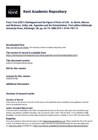 Frost, Tom (2021) Kierkegaard and the Figure of Form-of-Life. In: Norris, Marcos and Dickinson, Colby, eds. Agamben and the Existentialists. First edition. Edinburgh University Press, Edinburgh, UK, pp. 64-79. ISBN 978-1-4744-7877-9. E-ISBN 978-1-4744-7880-9. (KAR id:102868)