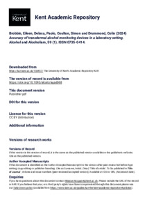 Brobbin, Eileen, Deluca, Paolo, Coulton, Simon, Drummond, Colin (2024) Accuracy of transdermal alcohol monitoring devices in a laboratory setting. Alcohol and Alcoholism, 59 (1). Article Number agad068. ISSN 0735-0414. (doi:10.1093/alcalc/agad068) (KAR id:103457)