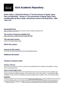 Darton, Robin A. (2024) Book Review of "The Environments of Ageing: Space, Place and Materiality". Review of: The Environments of Ageing: Space, Place and Materiality by Peace, Sheila. International Journal of Housing Policy, . ISSN 1949-1247. E-ISSN 1949-1255. (doi:10.1080/19491247.2024.2381284) (KAR id:106750)