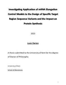 Darton, Louis (2024) Investigating application of mRNA elongation control models to the design of specific target region sequence variants and the impact on protein synthesis. Doctor of Philosophy (PhD) thesis, University of Kent,. (doi:10.22024/UniKent/01.02.107173) (KAR id:107173)