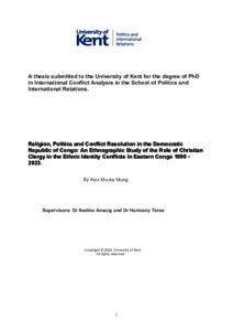 Ntung, Alex (2024) Religion, politics and conflict resolution in the Democratic Republic of Congo: An ethnographic study of the role of Christian clergy in the ethnic identity conflicts in Eastern Congo 1990 - 2023. Doctor of Philosophy (PhD) thesis, University of Kent,. (doi:10.22024/UniKent/01.02.107224) (KAR id:107224)