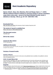 Dennis, Emily B., Diana, Alex, Matechou, Eleni, Morgan, Byron J. T. (2025) Efficient statistical inference methods for assessing changes in species’ populations using citizen science data. Journal of the Royal Statistical Society: Series A (Statistics in Society), 188 (3). pp. 641-657. ISSN 0964-1998. E-ISSN 1467-985X. (doi:10.1093/jrsssa/qnae105) (KAR id:107274)