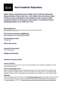 Albath, Elianne, Greifeneder, Rainer, Douglas, Karen, Cichocka, Aleksandra, Marques, Mathew, Wilson, Marc, Kerr, John, Sibley, Chris, Osborne, Danny (2024) Does lower psychological need satisfaction foster conspiracy belief? Longitudinal effects over three years in New Zealand. Personality and Social Psychology Bulletin, 52 (4). Article Number 1461672241. ISSN 0146-1672. (doi:10.1177/01461672241292841) (KAR id:107445)
