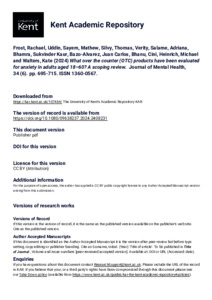Frost, Rachael, Uddin, Sayem, Mathew, Silvy, Thomas, Verity, Salame, Adriana, Bhamra, Sukvinder Kaur, Bazo-Alvarez, Juan Carlos, Bhanu, Cini, Heinrich, Michael, Walters, Kate and others. (2024) What over the counter (OTC) products have been evaluated for anxiety in adults aged 18–60? A scoping review. Journal of Mental Health, 34 (6). pp. 695-715. ISSN 1360-0567. (doi:10.1080/09638237.2024.2408231) (KAR id:107484)
