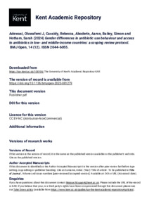 Adewusi, Oluwafemi J, Cassidy, Rebecca, Aboderin, Aaron, Bailey, Simon, Hotham, Sarah (2024) Gender differences in antibiotic use behaviour and access to antibiotics in low- and middle-income countries: a scoping review protocol. BMJ Open, 14 (12). Article Number e081279. ISSN 2044-6055. (doi:10.1136/bmjopen-2023-081279) (KAR id:108198)