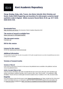 Zhang, Wenjing, Greig, Julia, Towers, Ann-Marie, Saloniki, Eirini-Christina, Darton, Robin (2025) Supporting care transitions for older people: a practice-based qualitative study in England. British Journal of Social Work, 55 (5). pp. 2217-2235. ISSN 0045-3102. E-ISSN 1468-263X. (doi:10.1093/bjsw/bcaf041) (KAR id:108724)
