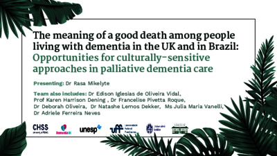 Mikelyte, Rasa, Harrison Dening, Karen, Pivetta Roque, Francelise, Oliveira, Deborah, Dekker, Natashe, Iglesias de Oliveira Vidal, Edison, Vanelli, Julia Maria, Ferreira Neves, Adriele (2024) The meaning of a good death among people living with dementia in the UK and in Brazil: Opportunities for culturally-sensitive approaches in palliative dementia care. In: The 36th Global Conference of Alzheimer's Disease International, 24-26 Apr 2024, Krakow, Poland. (Unpublished) (KAR id:108827)