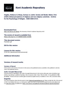 Hughes, Rebecca E, Sharp, Carissa A, Leicht, Carola, Elsdon-Baker, Fern (2025) Global perceptions of religious and non-religious scientists. Archive for the Psychology of Religion, . ISSN 0084-6724. E-ISSN 1573-6121. (doi:10.1177/00846724251314496) (KAR id:108908)
