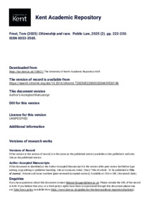 Frost, Tom (2025) Citizenship and race. Public Law, 2025 (2). pp. 222-230. ISSN 0033-3565. (KAR id:108927)