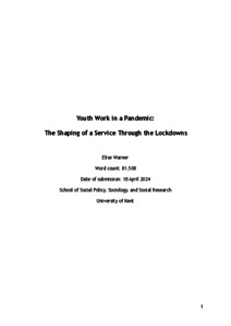 Warner, Elise (2025) Youth work in a pandemic: the shaping of a service through the lockdowns. Doctor of Philosophy (PhD) thesis, University of Kent,. (doi:10.22024/UniKent/01.02.109490) (KAR id:109490)