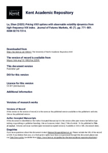 Lu, Shan (2025) Pricing VXX options with observable volatility dynamics from high-frequency VIX index. Journal of Futures Markets, 45 (7). pp. 771-801. ISSN 0270-7314. (doi:10.1002/fut.22591) (KAR id:109561)