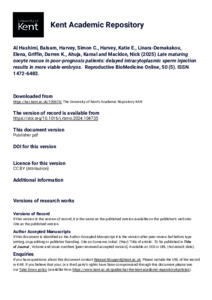 Al Hashimi, Balsam, Harvey, Simon C., Harvey, Katie E., Linara-Demakakou, Elena, Griffin, Darren K., Ahuja, Kamal, Macklon, Nick (2025) Late maturing oocyte rescue in poor-prognosis patients: delayed intracytoplasmic sperm injection results in more viable embryos. Reproductive BioMedicine Online, 50 (5). Article Number 104735. ISSN 1472-6483. E-ISSN 1472-6491. (doi:10.1016/j.rbmo.2024.104735) (KAR id:109619)