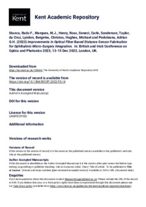Stancu, Radu F., Marques, M.J., Henry, Ross, Seneci, Carlo, Sanderson, Taylor, da Cruz, Lyndon, Bergeles, Christos, Hughes, Michael, Podoleanu, Adrian G.H. (2023) Improvements in Optical Fiber Based Distance Sensor Fabrication for Ophthalmic Micro-Surgery Integration. In: British and Irish Conference on Optics and Photonics 2023, 13-15 Dec 2023, London, UK. (doi:10.1364/BICOP.2023.PS.14) (KAR id:109644)
