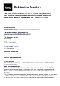 Lalot, Fanny, Greifeneder, Rainer, Abrams, Dominic (2025) Motivated to trust? Promotion and prevention focus are distinctly related to the tendency to trust others. Journal of Trust Research, . pp. 1-26. ISSN 2151-5581. E-ISSN 2151-559X. (doi:10.1080/21515581.2025.2486940) (KAR id:109684)