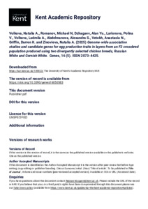 Volkova, Natalia A., Romanov, Michael N, Dzhagaev, Alan Yu., Larionova, Polina V., Volkova, Ludmila A., Abdelmanova, Alexandra S., Vetokh, Anastasia N., Griffin, Darren K., Zinovieva, Natalia A. (2025) Genome-wide association studies and candidate genes for egg production traits in layers from an F2 crossbred population produced using two divergently selected chicken breeds, Russian White and Cornish White. Genes, 16 (5). Article Number 583. ISSN 2073-4425. (doi:10.3390/genes16050583) (KAR id:109923)