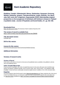 Khobkhun, Fuengfa, Vititwatanakul, Nirrasa, Siwhatrakoo, Kanyaporn, Somvong, Wilailuk, Suttiwong, Jatuporn, Thanakamchokchai, Jenjira, Richards, Jim, Bowd, Jake, Ball, Lewis, Trongtortam, Suparawadee and others. (2025) Understanding caregiver perspectives on the management of individuals with Parkinson’s disease in Thailand: A qualitative study. Journal of Population and Social Studies, 34 . pp. 362-382. E-ISSN 2465-4418. (KAR id:110196)
