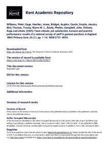 Williams, Peter, Gage, Heather, Jones, Bridget, Aspden, Carole, Smylie, Jessica, Bird, Thomas, Touray, Morro M. L., Brady, Phelim, Campbell, John, Chilvers, Rupa, and others. (2025) Team climate, job satisfaction, burnout and practice performance: results of a national survey of staff in general practices in England. BMC Primary Care, 26 (1). pp. 1-16. ISSN 2731-4553. (doi:10.1186/s12875-025-02780-7) (KAR id:110215)