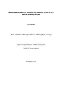 Forbes, Daniel (2025) The modernization of the postal service: Identity, public service, and the meaning of work. Doctor of Philosophy (PhD) thesis, University of Kent,. (doi:10.22024/UniKent/01.02.110279) (KAR id:110279)