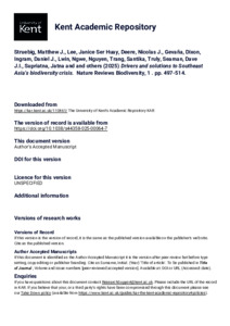 Struebig, Matthew J., Lee, Janice Ser Huay, Deere, Nicolas J., Gevaña, Dixon, Ingram, Daniel J., Lwin, Ngwe, Nguyen, Trang, Santika, Truly, Seaman, Dave J.I., Supriatna, Jatna, and others. (2025) Drivers and solutions to Southeast Asia’s biodiversity crisis. Nature Reviews Biodiversity, 1 . pp. 497-514. E-ISSN 3005-0677. (doi:10.1038/s44358-025-00064-7) (KAR id:110461)