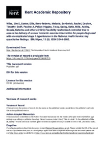 Wiles, Jim D, Santer, Ellie, Rees-Roberts, Melanie, Borthwick, Rachel, Doulton, Timothy, Swift, Pauline A, Pellatt-Higgins, Tracy, Saxby, Katie, Mills, Ashley, Gousia, Katerina, and others. (2025) Feasibility randomised controlled trial to assess the delivery of a novel isometric exercise intervention for people diagnosed with uncomplicated stage 1 hypertension in the National Health Service: key quantitative findings. BMJ Open, 15 (6). Article Number e091219. ISSN 2044-6055. (doi:10.1136/bmjopen-2024-091219) (KAR id:110631)