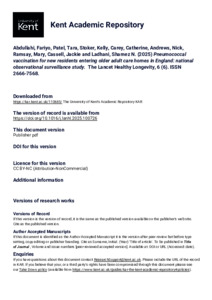 Abdullahi, Fariyo, Patel, Tara, Stoker, Kelly, Carey, Catherine, Andrews, Nick, Ramsay, Mary, Cassell, Jackie, Ladhani, Shamez N. (2025) Pneumococcal vaccination for new residents entering older adult care homes in England: national observational surveillance study. The Lancet Healthy Longevity, 6 (6). Article Number 100726. ISSN 2666-7568. (doi:10.1016/j.lanhl.2025.100726) (KAR id:110685)