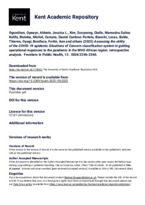 Ogundiran, Opeayo, Abbate, Jessica L., Kim, Sooyoung, Diallo, Mamadou Saliou Kalifa, Muteba, Michel, Camara, Daniel Cardoso Portela, Bianchi, Lucas, Balde, Thierno, Oyugi, Boniface, Fortin, Ann, and others. (2025) Assessing the utility of the COVID-19 epidemic Situations of Concern classification system in guiding operational responses to the pandemic in the WHO African region: retrospective analysis. Frontiers in Public Health, 13 . Article Number 1562525. ISSN 2296-2565. (doi:10.3389/fpubh.2025.1562525) (KAR id:110882)